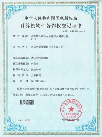 公司的卓礫智兵器動態參量綜合測試軟件V1.0獲得中華人民共和國國家版權局計算機軟件著作權登記證書。