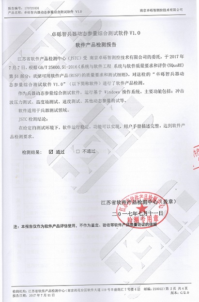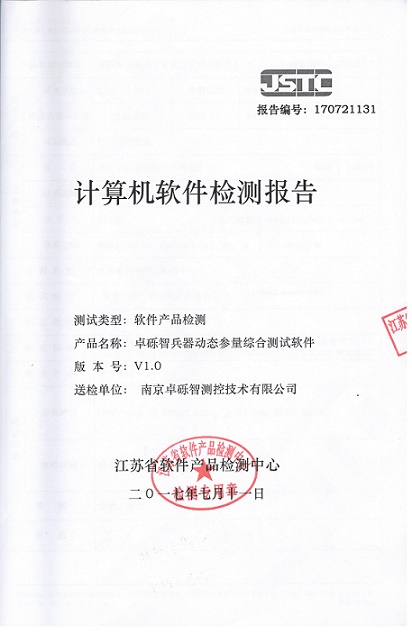 公司的卓礫智兵器動態參量綜合測試軟件順利通過江蘇省軟件產品檢測中心的檢測。