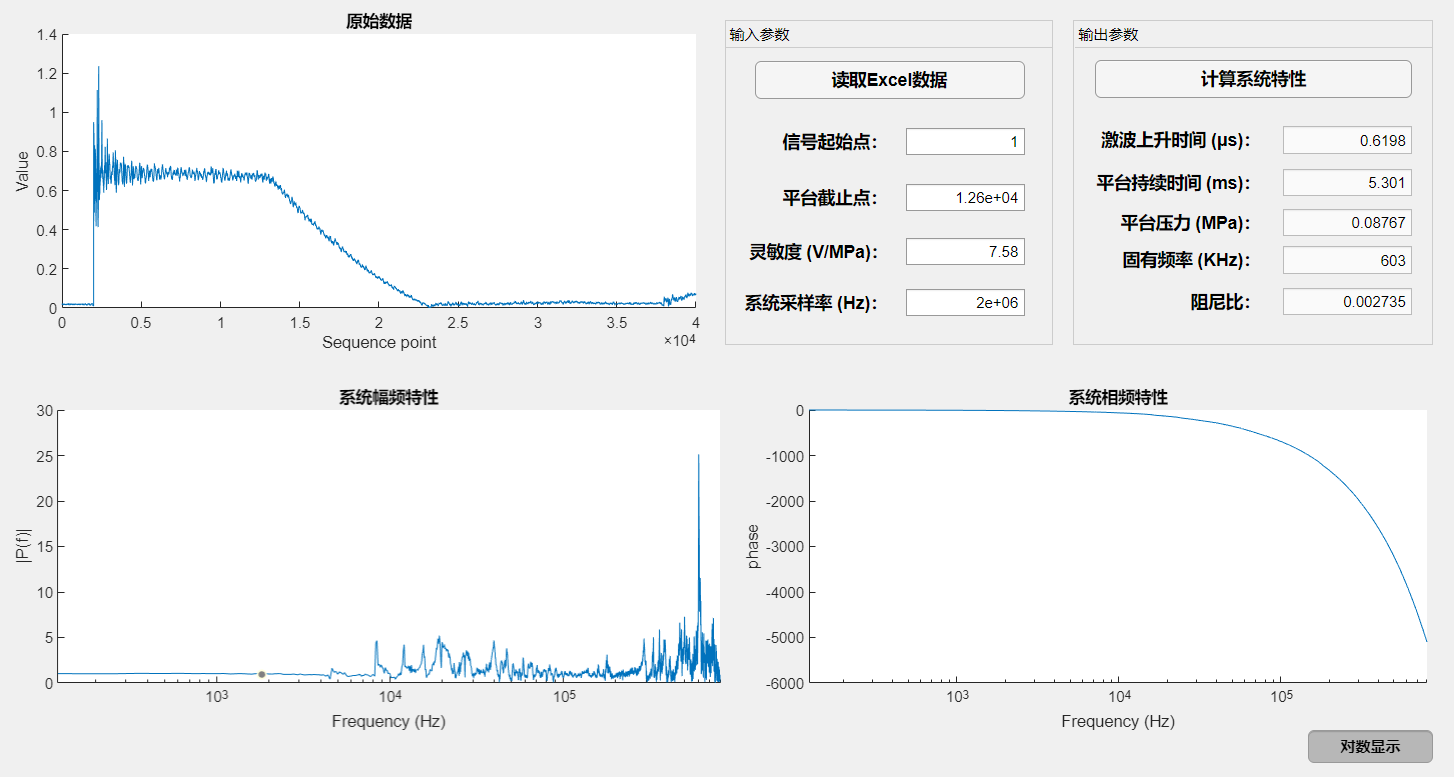 激波管測試數據處理軟件與激波管校準裝置及測試系統搭配使用,本軟件可根據捕獲的階躍壓力信號計算上升時間、平臺時間、壓力平臺持續時間、平臺壓力等時域指標;以及阻尼比、固有頻率等系統的動態特性指標,并繪制幅頻特性曲線和相頻特性曲線。